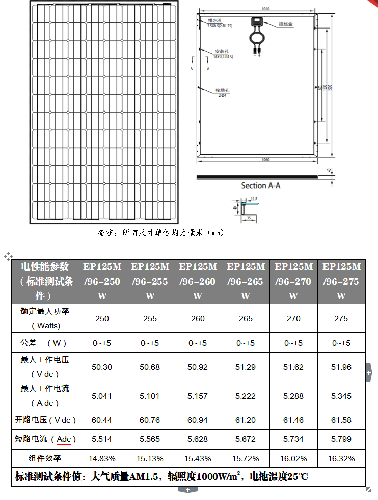 125單晶96片組件(250W-275W)工程圖紙(2BB)