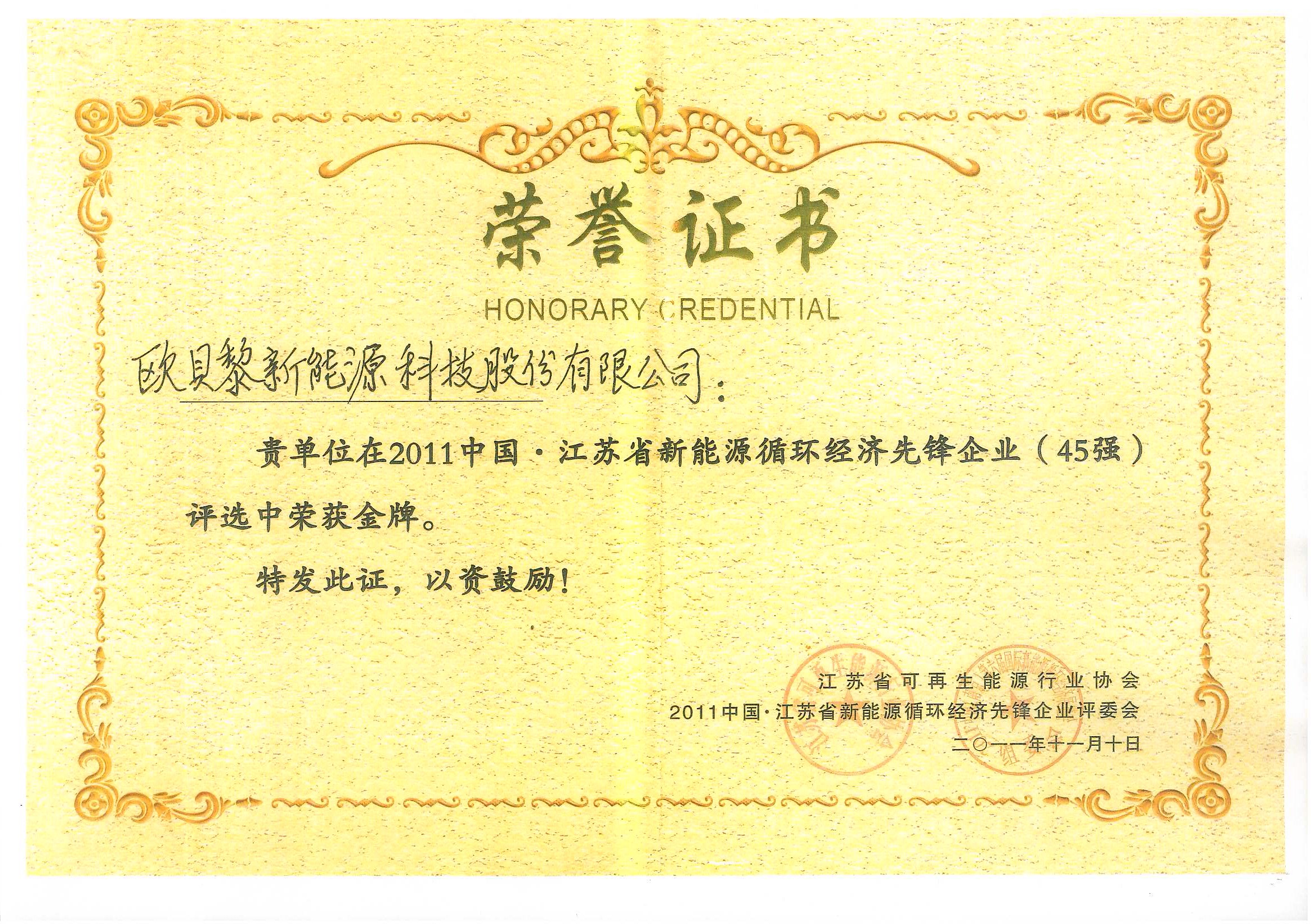 江蘇省新能源循環(huán)經(jīng)濟先鋒企業(yè)金牌